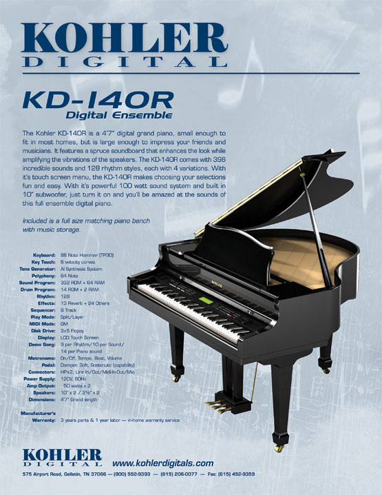 The Kohler KD-140R is a 4’7” digital grand piano that is small enough to fit in most homes, but is large enough to impress your friends and musicians. It features a spruce soundboard that enhances the look while amplifying the vibrations of the speakers. The KD-140R comes with 396 incredible sounds and 128 rhythm styles, each with 4 variations. With it’s touch screen menu, the KD-140R makes choosing your selections fun and easy. With it’s powerful 100 watt sound system and built in 10” subwoofer, just turn it on and you’ll be amazed at the sounds of this full ensemble digital piano.